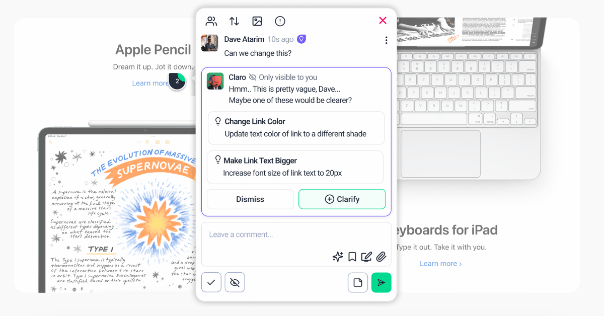 What if it’s somebody else’s suggestion needs explaining? Claro can help with that too (yet another round of back and forth avoided!)
