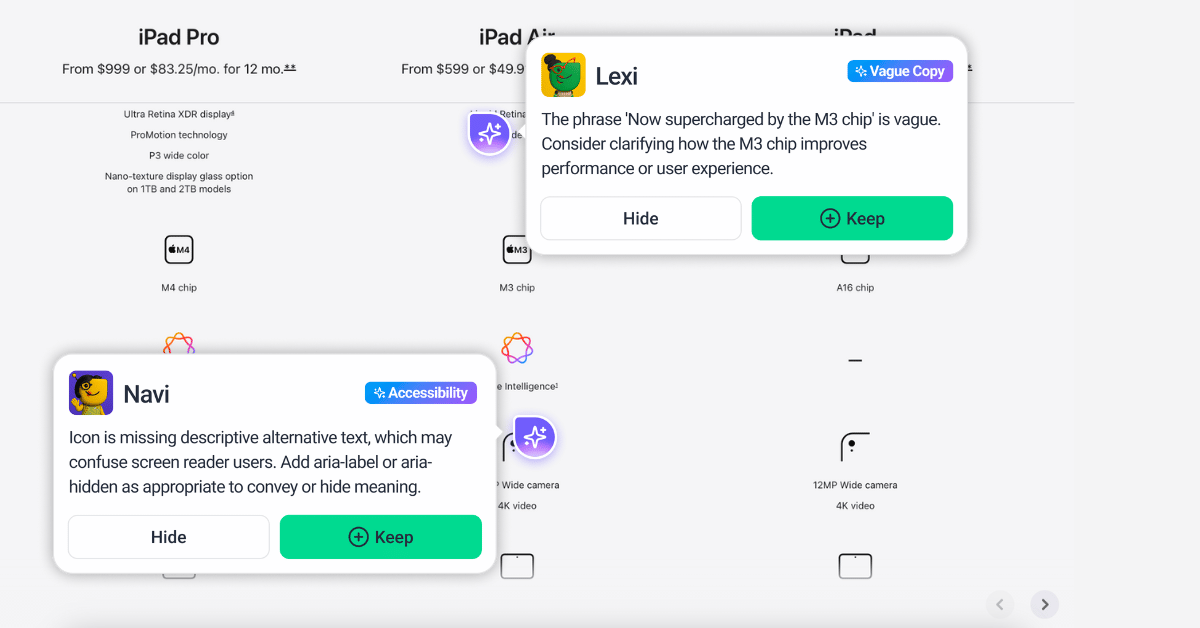 Accessibility is hard (and a big time-sink) and Navi is there to help. Spend less time snagging and more time shipping, while Lexi makes everything sound crisp and clear.